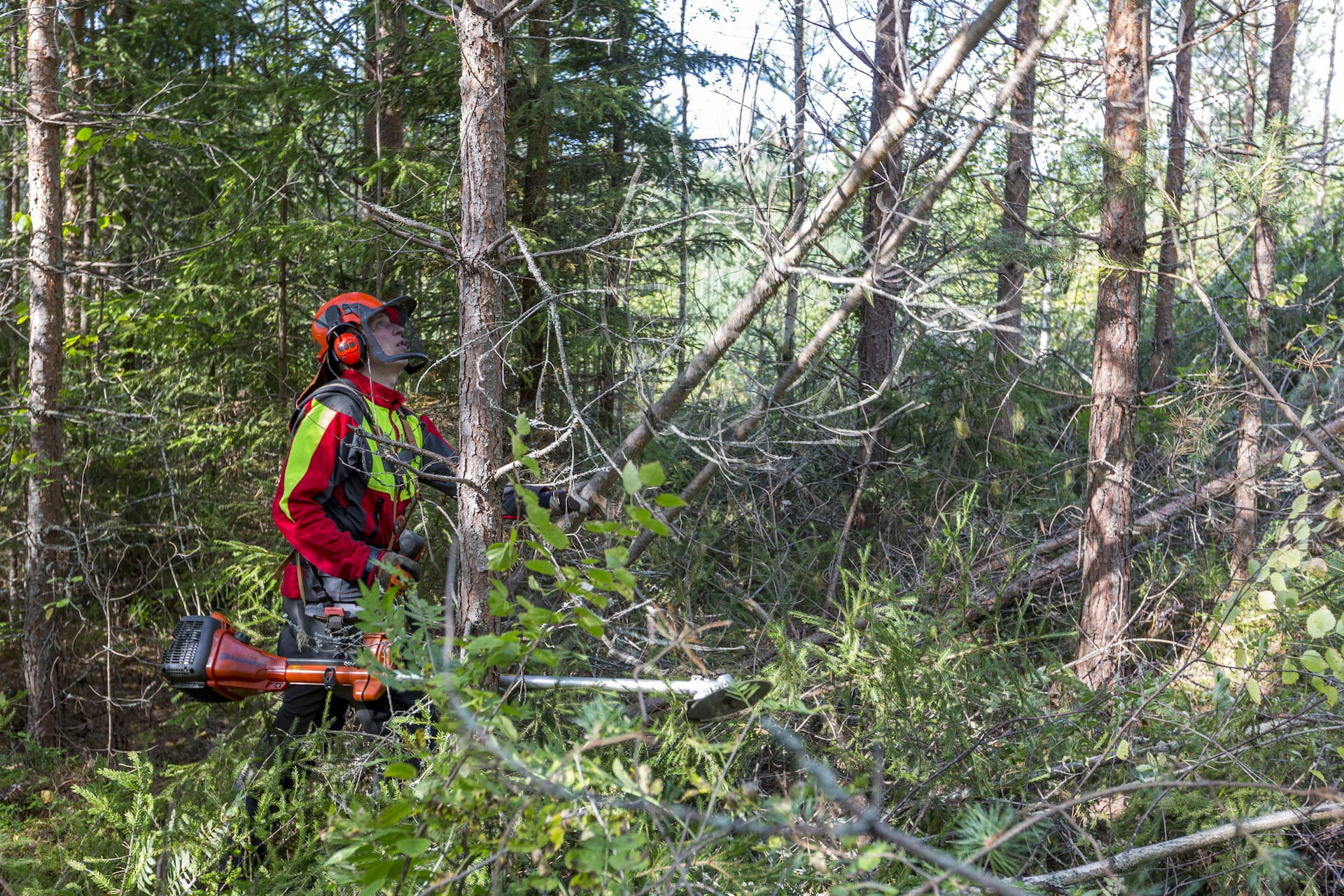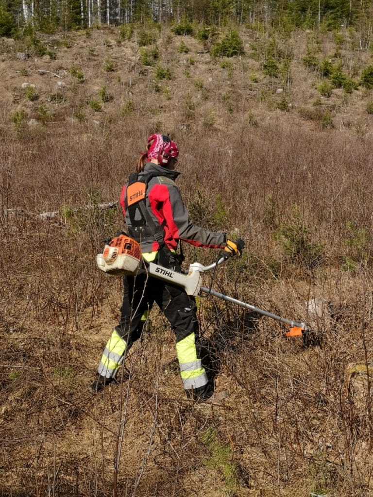 Keväinen tanssi raivaussahan kanssa käynnissä kuusen taimikossa.