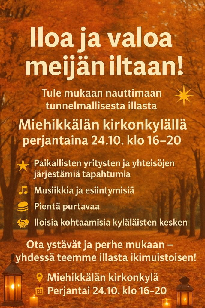 Iloa ja valoa meijän iltaan- tapahtuma Miehikkälässä 24.10.2025