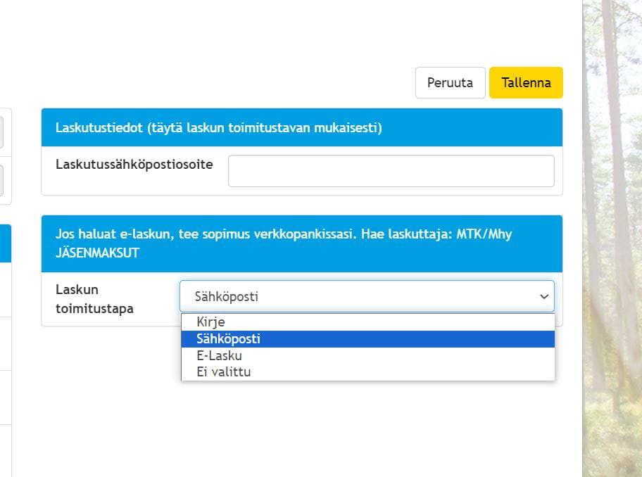 Metsänhoitoyhdistykset ja MTK ovat siirtyneet jäsenmaksulaskutuksessaan käyttämään ensisijaisena laskutustapanaan sähköisiä laskutuskanavia. Jatkossa postitse lähetettävästä laskusta tullaan perimään mm. paino- ja jakelukuluja kattava viiden euron laskutuslisä.