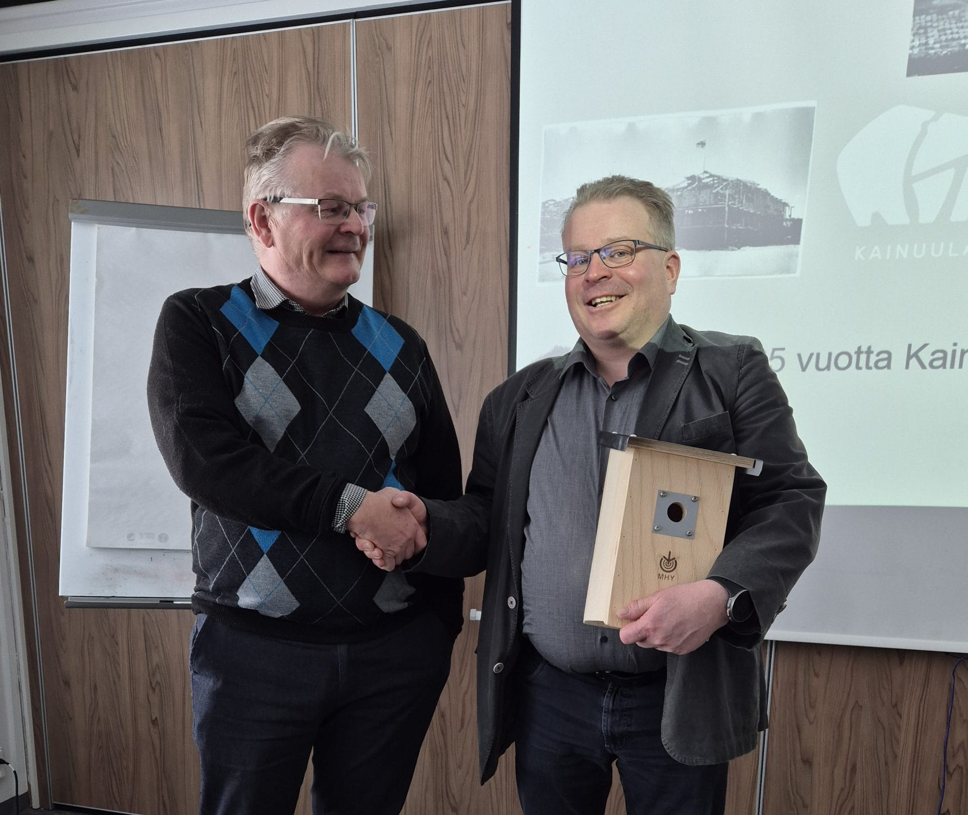 Artikkelikuvassa Jarmo Huttunen (vas.) kiittää Kuhmo Oy:n toimitusjohtaja Tommi Ruhaa tähänastisesta yhteistyöstä.