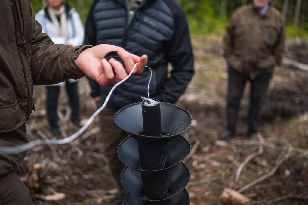 Som avslutning fick deltagarna besöka ett av de områden i Österbotten där granbarkborrefällor placerats ut inom ramen för Naturresursinstitutet LUKE:s kartläggningsprojekt. Denna del av exkursionen belyste det förebyggande arbete som görs för att övervaka skadegöraren. Även om Österbotten ännu inte syns på LUKE:s karttjänst för 2025, kommer regionens data att inkluderas i den slutrapport som LUKE publicerar i slutet av året. Mängden granbarkborrar mäts i milliliter, där en milliliter motsvarar omkring 40 granbarkborrar. Vad gäller placering av fällorna, är kriterierna noggranna. Fällorna ska placeras på ytor där minst 50 % är granskog, där avverkning skett mellan 1.9.2024–1.4.2025 och där det inte tidigare rapporterats skador.