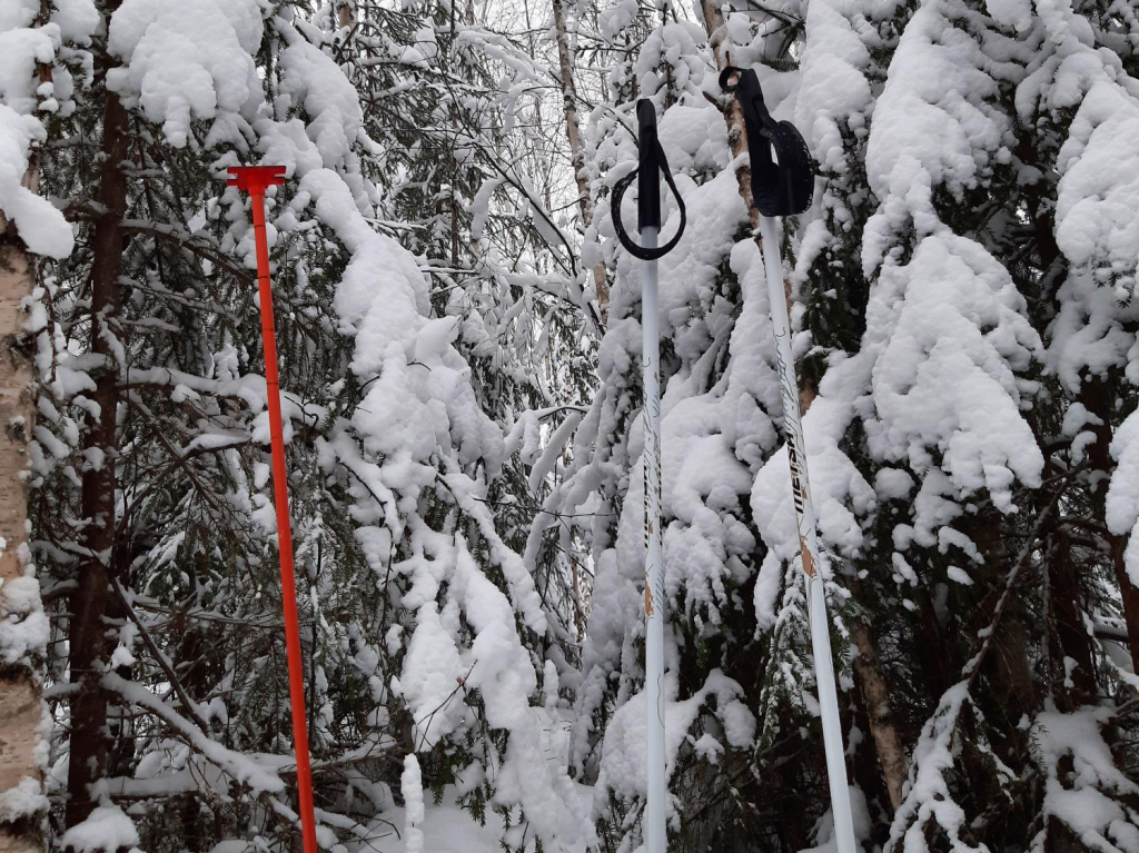 Eräänä talvena työkaveri pyysi ottamaan (hyviä) metsäisiä työkuvia. Pidin itselle hömppänä, kun olen huono kuvaamaan. Kun sitten kerran tökkäsin sauvat hankeen, riisuin hanskat ja keskityin, että no nyt on paikka, mistä voisi oikein komean lumisen metsäkuvan saada – räps! Ja olin selälläni pää alamäkeen, sukset ylämäkeen ja alla melkein metrinen hanki. Kuva tuli, ei ihan sellainen kuin piti ja kesti ikuisuuden riuhtoa itsensä takaisin hangen päälle tuosta asetelmasta. Ja lunta oli joka välikössä. Vannoin, etten kuvaa enää ikinä töissä.