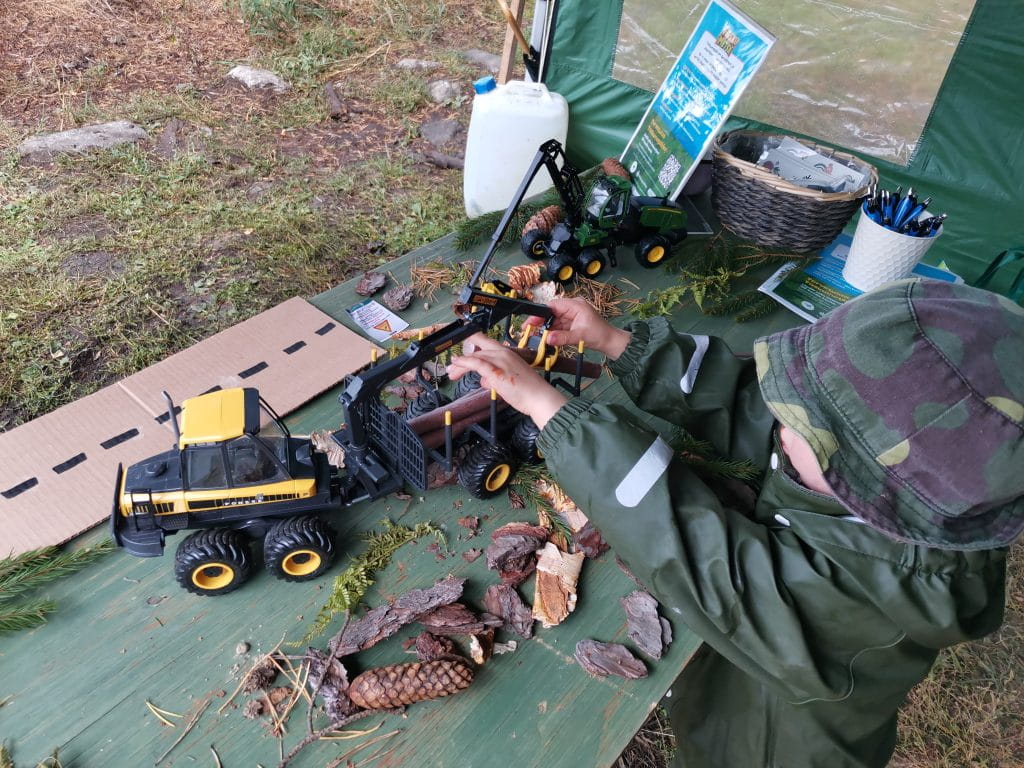 Lapsille oli rakennettu metsäkonerata, jossa pääsi kokeilemaan puun kuormaamista.