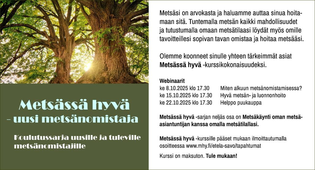 Syksyn kurssi Uusille ja tuleville metsänomistajille starttaa ke 8.10.2025 klo 17.30.