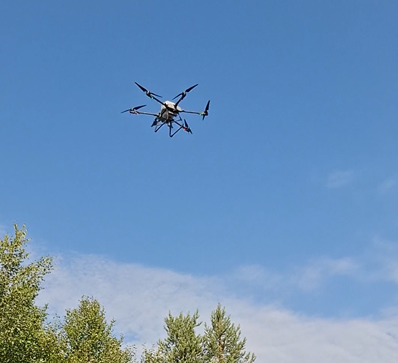 Drooni palaamassa lennolta täydentämään säiliöön rakeistettua booria uutta keikkaa varten.